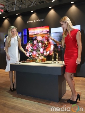 LG전자는 4mm 이하의 얇은 두께로 벽과의 일체감이 탁월한 65인치 4K ‘올레드 월페이퍼’, 베젤이 3.5mm까지 얇아진 ‘올레드 비디오월’ 등 다양한 올레드 사이니지 제품들도 선보였다.