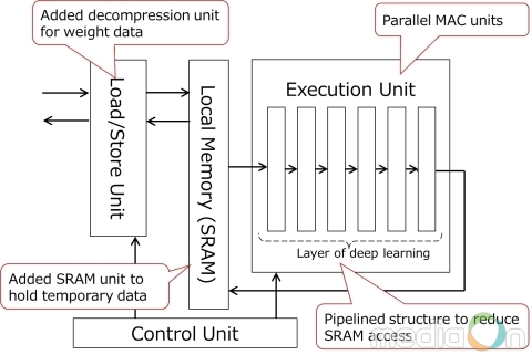 · SRAM 접속 축소. 기존의 딥러닝은 각각의 DNN 레이어를 처리한 후 SRAM에 접속해야 한다. 전력 소모를 키우는 요인이다. 도시바의 딥러닝 가속기는 DNN의 DNN 처리 장치에 파이프라인 레이어 구조를 구축했다. 따라서 한 번의 SRAM 접속으로 일련의 DNN 계산을 실행할 수 있다.